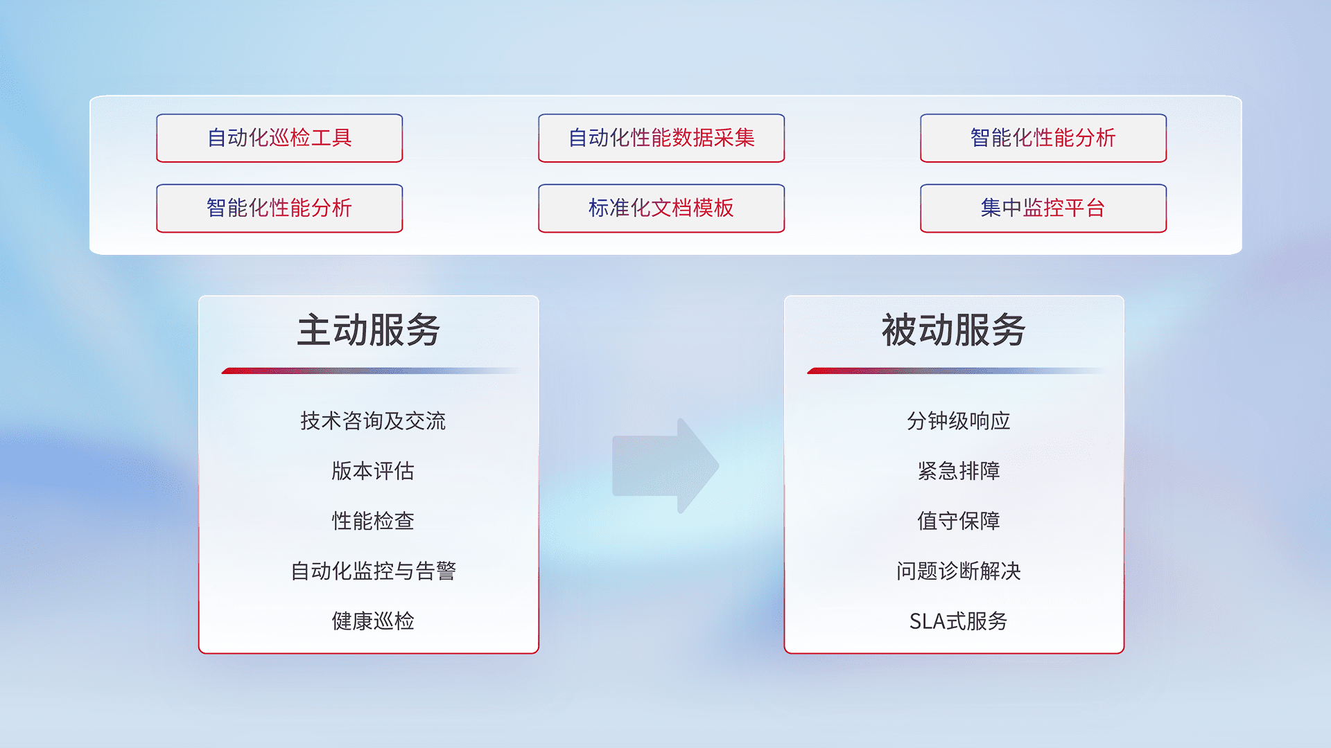 智能化工具和标准化文档,,保障服务质量,,,,提供主动服务(包含技术咨询、、、版本评估、、、性能检查、、、自动化监控与告警、、、、健康巡检)和被动服务包含(分钟级响应、、、紧急排障、、、值守保障、、问题诊断解决、、、SLA服务)。。。